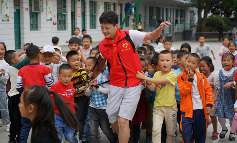 志愿者與孩子們玩“老鷹捉小雞”互動游戲