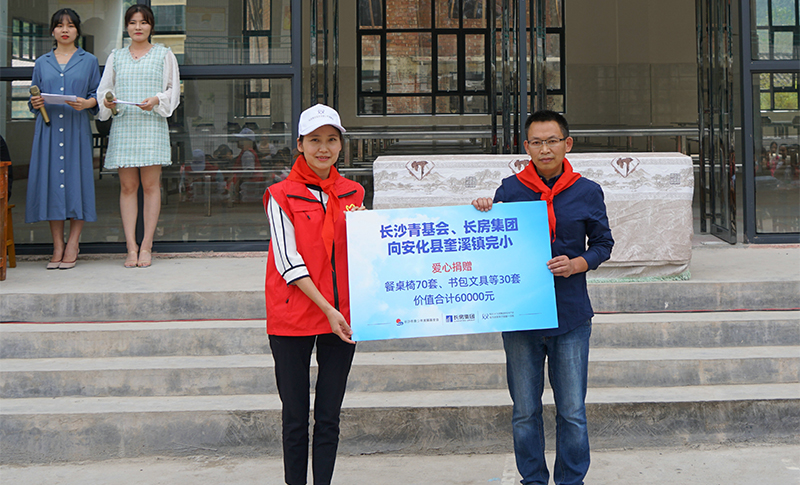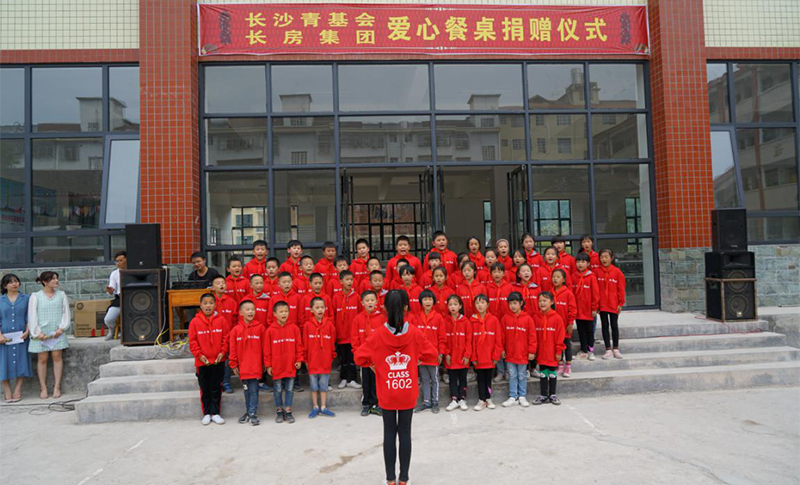 “金色的駝鈴,叮當叮當,小駱駝帶著它走向遠方,追趕著春天的腳步叮當,走向綠色的希望。”稚嫩清脆的歌聲在安化縣奎溪鎮完全小學校園里響起,融化著眾人的心。2019年9月25日,長沙青基會與長房集團共同舉行的“大愛奎溪完小、情暖校園食堂”愛心餐桌椅捐贈儀式在安化縣奎溪鎮完小舉行。儀式現場,長房集團“藍絲帶”愛心傳遞基金向學校捐贈了70套餐桌椅,并給學校30名貧困學生帶來了書包、文具等新學期禮物,本次愛心捐贈價值60000元。長房集團黨群工作部負責人,長沙市青少年發展基金會辦公室負責人,長房集團十余名青年志愿者,安化縣教育基金會、奎溪鎮政府、奎溪鎮中心學校的領導及奎溪鎮完小師生代表出席了捐贈儀式。