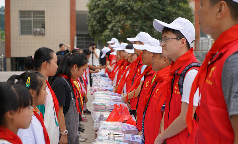 志愿者給貧困學生送上書包等文具